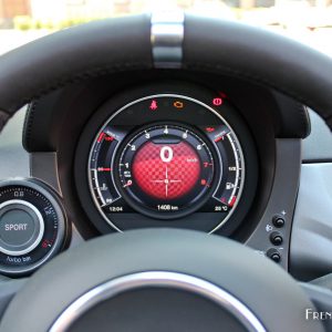À bord, l’intérieur typique des 500 Abarth se concentre sur l’essentiel, avec quelques éléments spécifiques pour la Pista : on y retrouve une planche de bord grise satinée, un pédalier, repose-pied et seuils de porte aluminium, ou encore un volant sport en cuir doté d’un point milieu en aluminium. De série, les sièges sport sont garnis de tissu, mais peuvent recouverts de cuir en option à 1200 €. Comme à l’accoutumée, la position de conduite est assez peu confortable pour les grands gabarits : la faute à un volant qui est uniquement réglable en hauteur et non en profondeur.