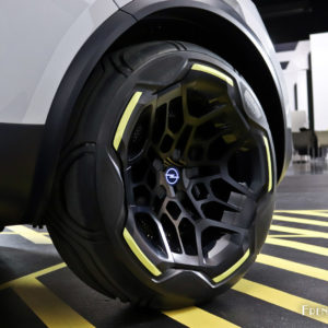 Long de 4,06 mètres sur 1,53 mètre de haut, ce concept-car adopte des lignes fluides et affirmées, mais ce n’en est pas moins un objet hautement technologique, qui a été conçu par les équipes de design de la marque selon un principe qu’ils appellent la « détox visuelle ». Il s’agit de repenser chaque élément d’une automobile pour atteindre une certaine pureté des lignes, tout en éliminant les éléments inutiles, comme les rétroviseurs remplacés par des caméras. La silhouette aérienne de la voiture est scindée en deux parties par un liseré jaune typique d’Opel : la partie inférieure, forte et dynamique, est animée par un gris clair et lumineux, tandis que les capot, toit et surfaces vitrées sont revêtues d’une teinte bleu nuit, tirant presque vers le noir. En partie basse, nous retrouvons de larges jantes de 17 pouces au design sophistiqué, qui font écho aux bas de caisse marqués de formes hexagonales, qui intègrent un petit écran permettant de connaître d’un simple coup d’œil la charge de la batterie.