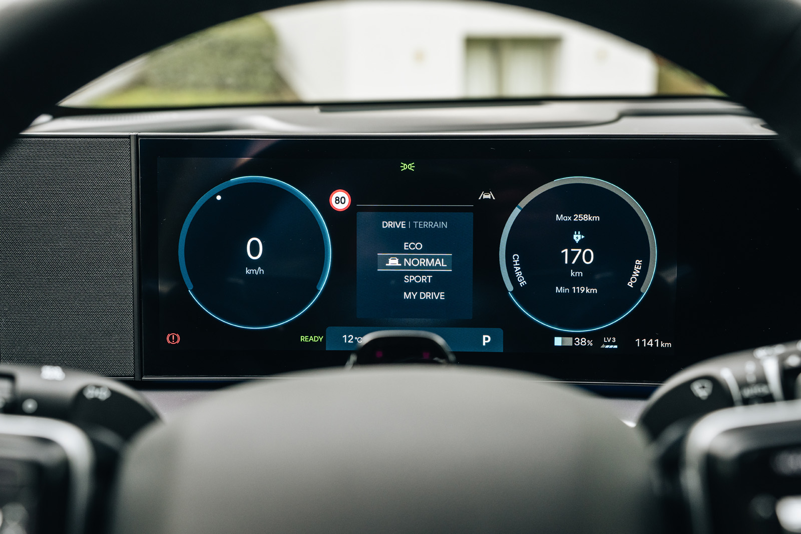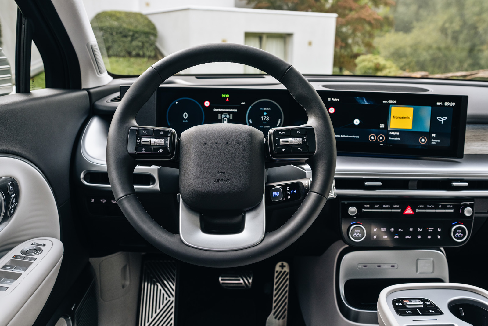 Toutes les versions du Hyundai Ioniq 9 disposent d’une batterie de grande capacité (110 kW) à technologie Lithium-ion Polymère. En revanche, le modèle d’accès dispose d’une motorisation forte de 218 chevaux, un peu juste en matière de performances, surtout avec un engin qui pèse au minimum 2,5 tonnes. Notre choix s’est porté sur la version HTRAC, qui outre ses quatre roues motrices, dispose d’une puissance de 307 ch.