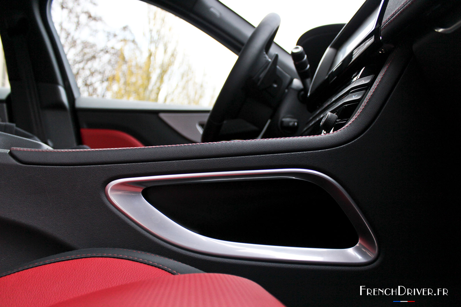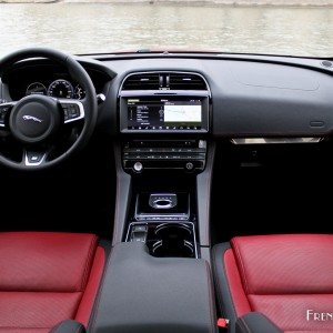 A bord, nous retrouvons l’ambiance des nouvelles XE et XF, avec notamment ce garnissage cuir bi-ton noir et rouge, agrémenté de surpiqûres ponctuant l’ensemble de l’habitacle, à l’esprit très sportif. Notre modèle de présentation étant une pré-série, il ne nous a pas permis de juger objectivement des qualités de finition de la nouvelle Jaguar F-Pace, mais nous pouvons déjà affirmer que le design intérieur a été particulièrement soigné.